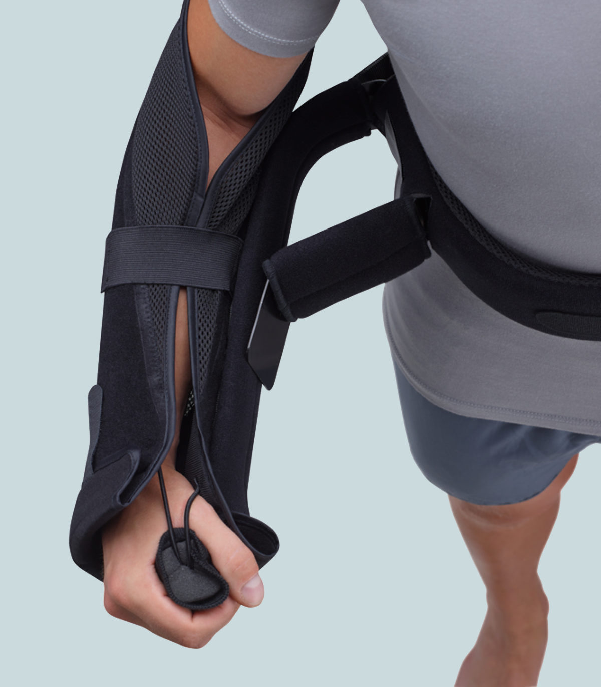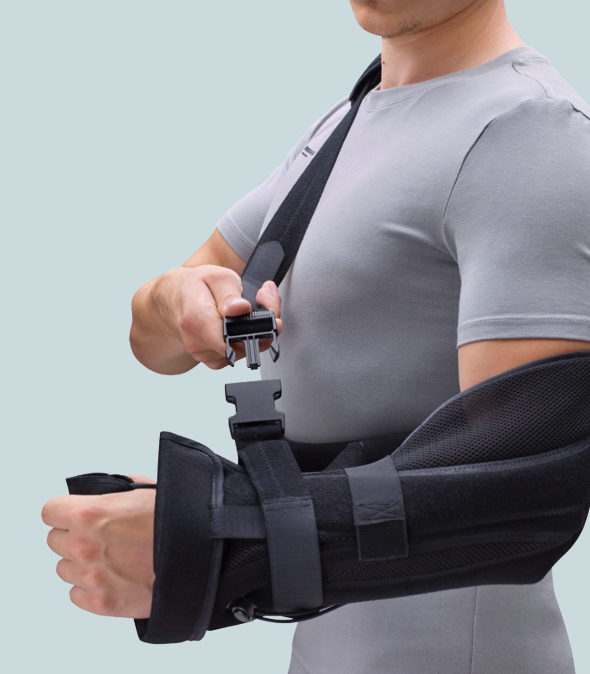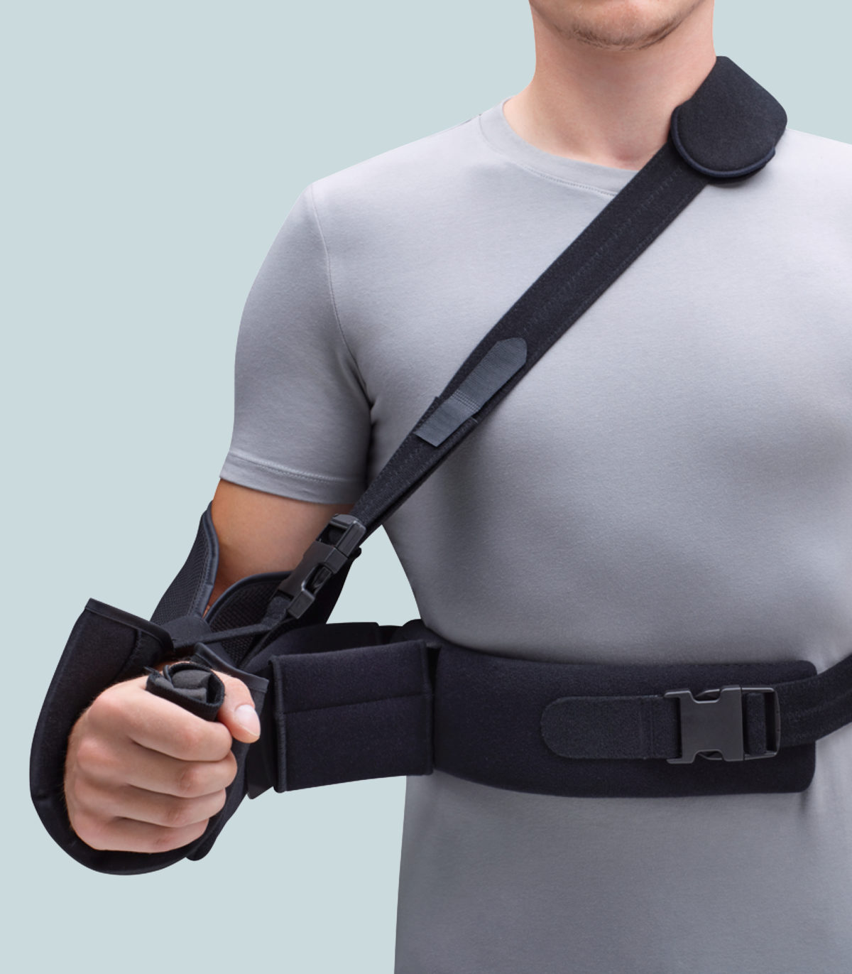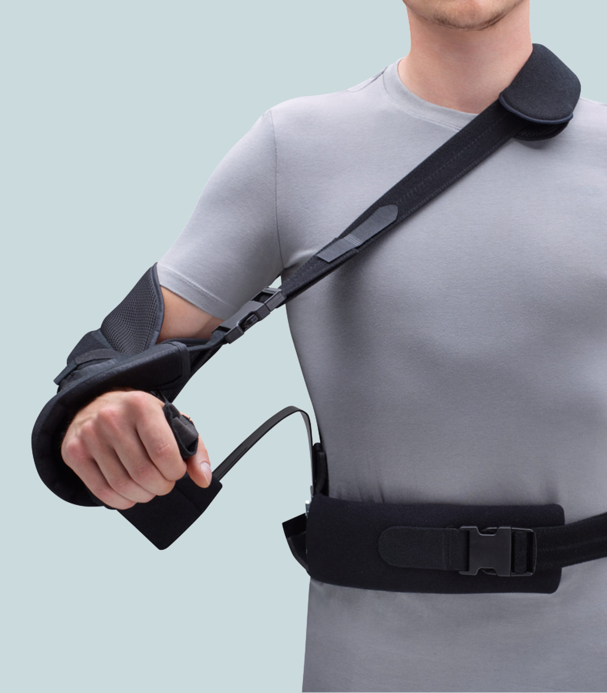 Shoulder post-op sling provides a secure positioning of the arm in a adjustable abduction angle